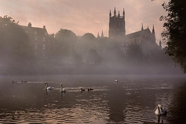 朝靄のセバーン川とウスター大聖堂 ― イギリス・イングランド